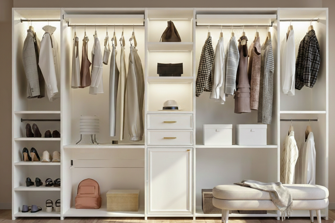 Most apartment closets are an afterthought. Nomad Closets is the fix — modular oak shelving that clicks together without tools, transforming bare shelves into a fully organized wardrobe system.